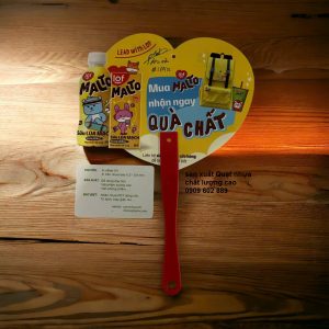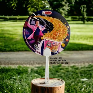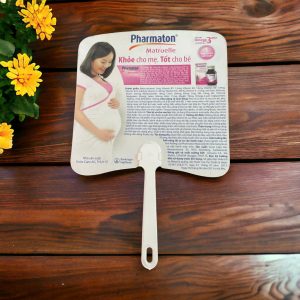 sản xuất Quà tặng, quà tặng khuyến mãi: Quạt nhựa. In offset UV, in 4 màu CMYK, 2 mặt, Cắt, bế gia nhiệt, gắn cán nhựa dài 17 cm (tán reve cố định), hoặc gắn cán nhựa cán nắp trượt (dài 12 cm).